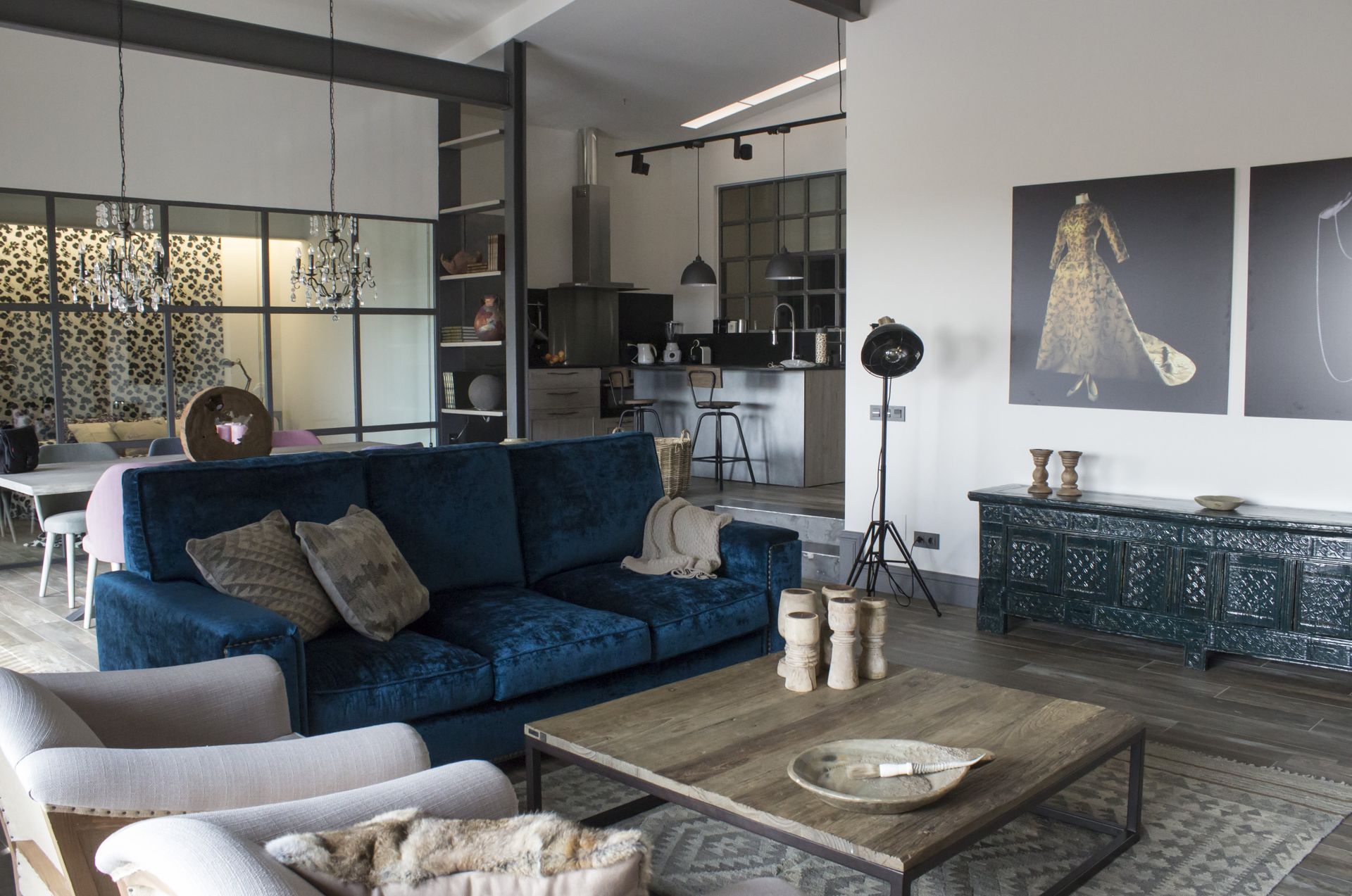 Damos un paseo por este fabuloso loft; un honor colaborar en este proyecto de interiorismo en el que se ve reflejado el estilo de vida de una artista con reconocimiento internacional y con un espíritu creativo hilvanado con pasión, sentimiento y emociones bordadas.
